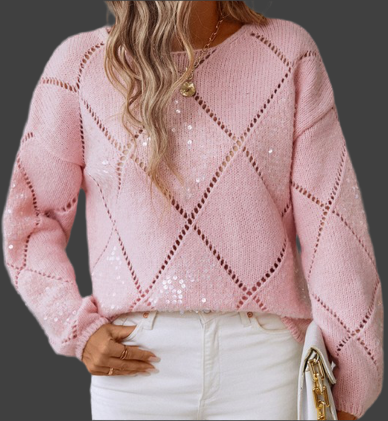 Elevate your wardrobe with the Hallowed Rhombus Pattern Sequin Detailed Sweater. This lightweight piece features sophisticated openwork paired with delicate sequins, offering a refined shimmer that enhances its timeless round neck and relaxed fit. Designed for seamless style and comfort, it effortlessly combines casual ease with elegant detail, making it an essential addition for those who appreciate understated luxury. With only one left in stock, don’t miss the chance to add this distinctive sweater to your collection.